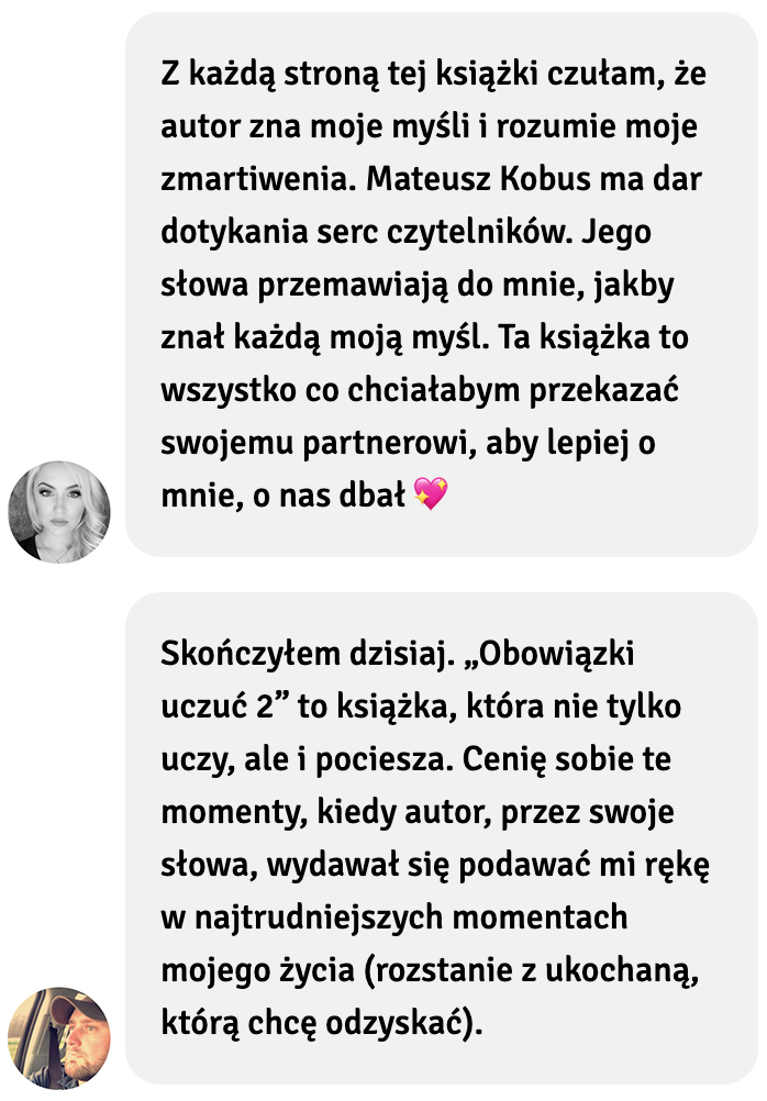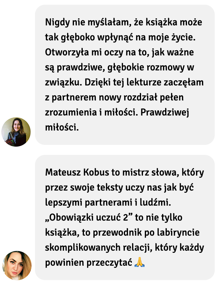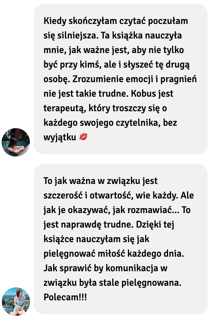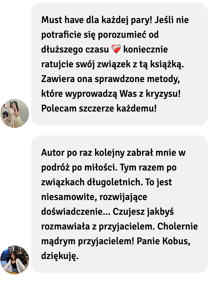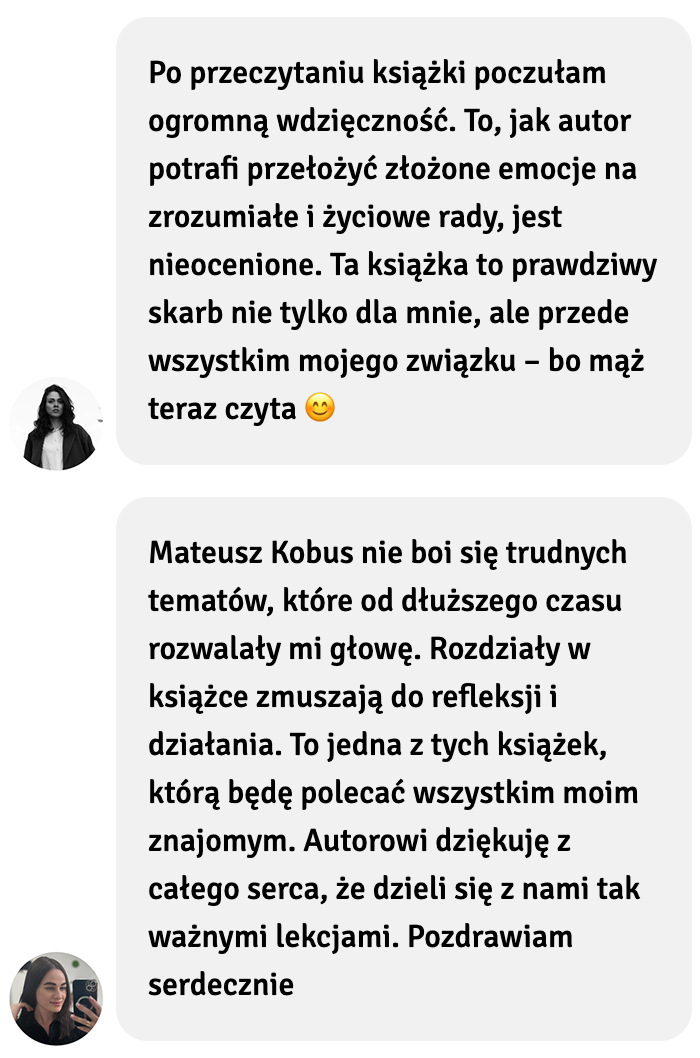 Mateusz Kobus – jeden z najpopularniejszych w Polsce autorów piszących o relacjach i miłości w mediach społecznościowych, na których skupia ponad 700 tysięcy czytelników. Od 13 lat działa na rzecz edukowania ludzi w budowaniu świadomych i szczęśliwych relacji z partnerem.