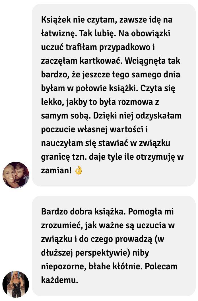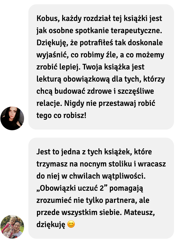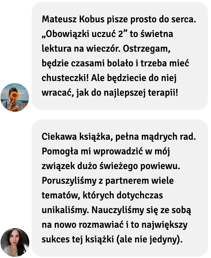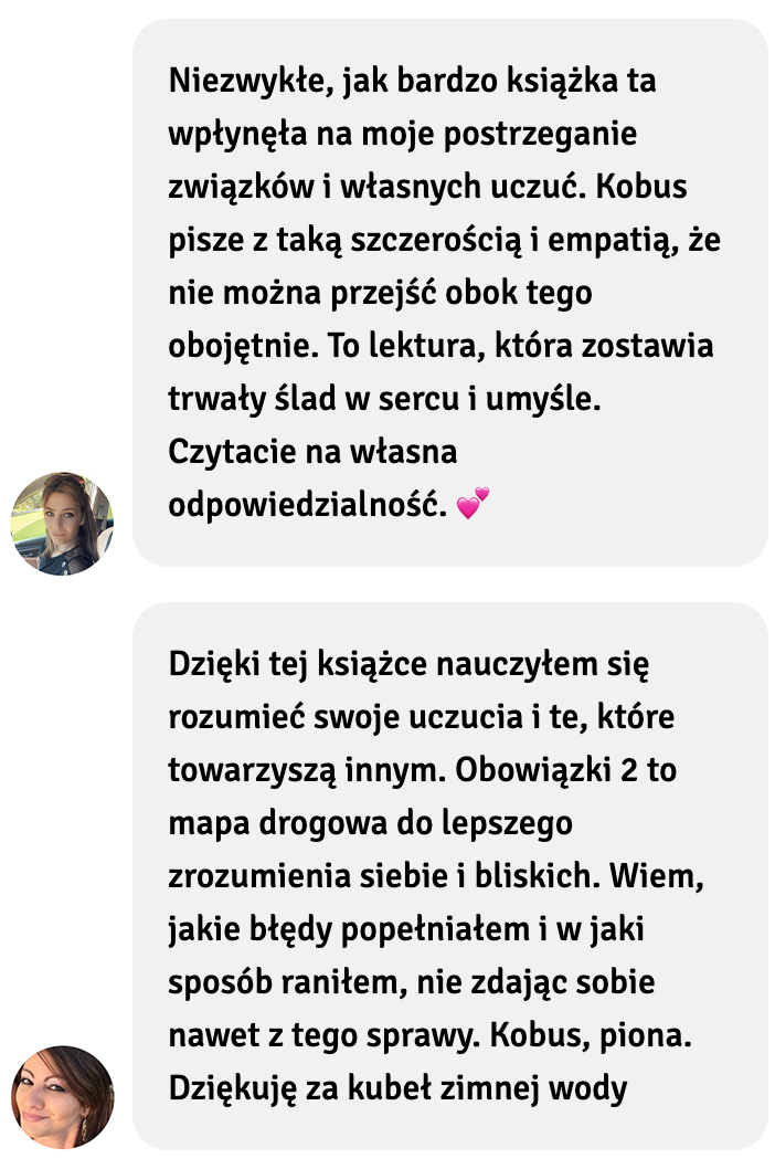 „Obowiązki Uczuć 2” zawierają informacje i wskazówki, które poprowadzą Was poza zawiłość waszej relacji i schematy, w których nieświadomie tkwicie. Ten bestsellerowy poradnik rozkocha Was w sobie na nowo i nauczy żyć w emocjonalnej dojrzałości, w której ludzie się rozumieją i chcą brać odpowiedzialność za to, jak wygląda ich życie uczuciowe.