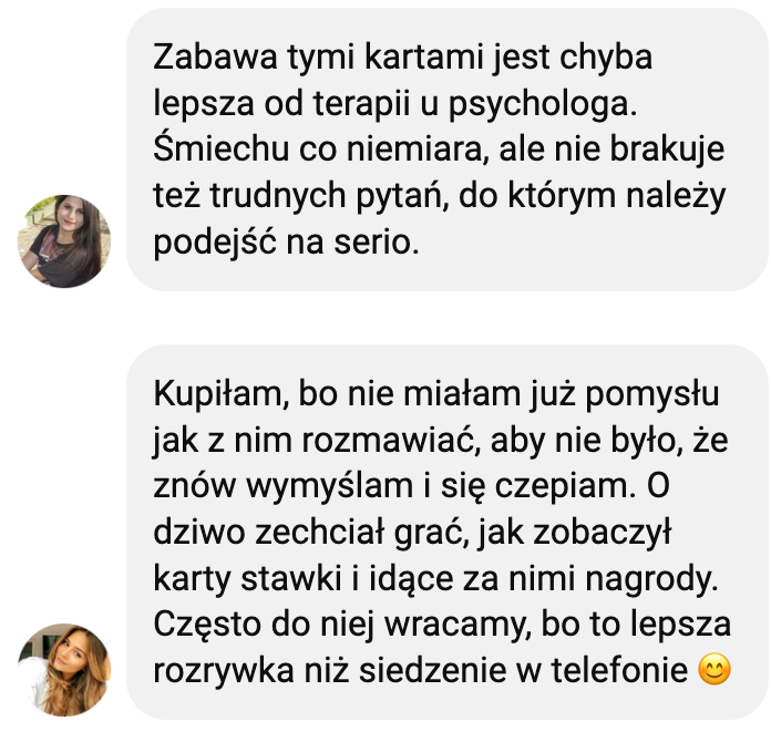 We współpracy z psychologami starannie wyselekcjonowaliśmy 250 kluczowych dla relacji pytań oraz 40 przezabawnych wyzwań, które sprawią, że będziecie się świetnie bawić, a zarazem poprawicie Waszą komunikację, poczucie wzajemnego zrozumienia i wzmocnicie więź, która Was łączy. Gra pomoże Wam przepracować trudne tematy oraz przełamać codzienną rutynę.