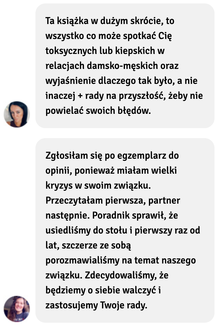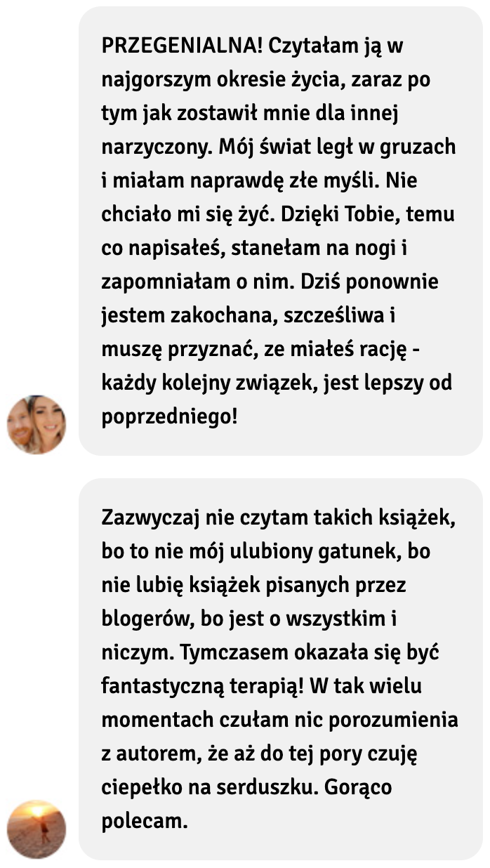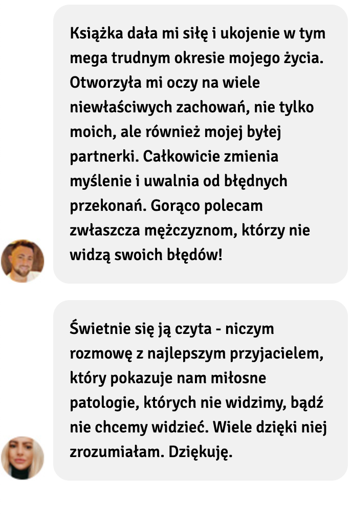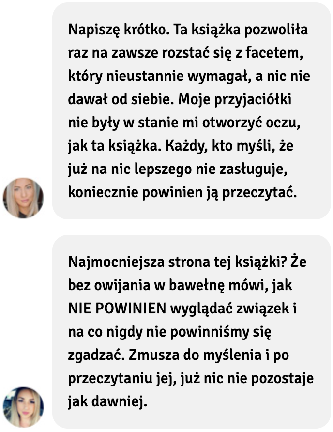 To do Ciebie będzie należeć decyzja, czy chcesz o swój związek walczyć, czy jak najszybciej się od niego uwolnić i zacząć brać od życia i miłości to co Ci się należy. Jeśli zaś zostałaś skrzywdzona i porzucona znajdziesz w niej czułe wsparcie i sprawdzone metody na to, jak zapomnieć, odzyskać dawną, szczęśliwą siebie i ruszyć do przodu z miłością własną i podejściem, dzięki któremu, już nigdy nie pozwolisz się skrzywdzić.